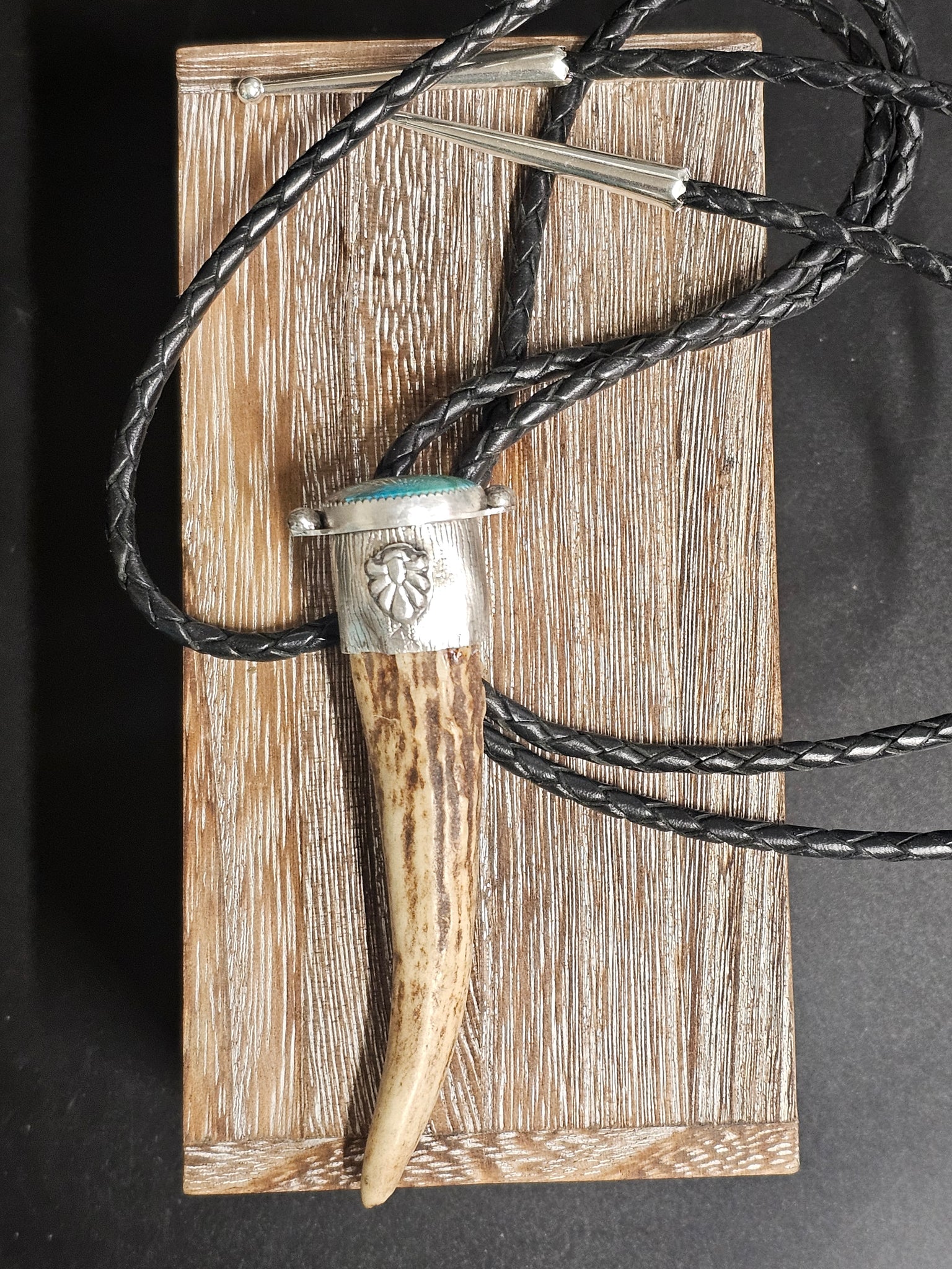 Turquoise Vintage circle Shaped stone surrounded by plane bezel, and 6 silver balls. All made with Sterling Silver. Holding on to a Elk Antler