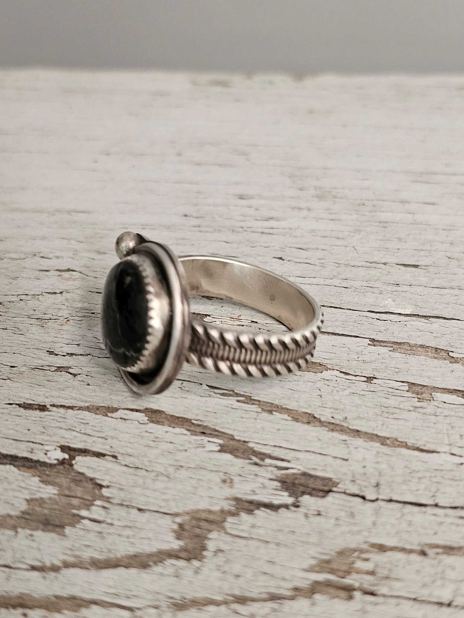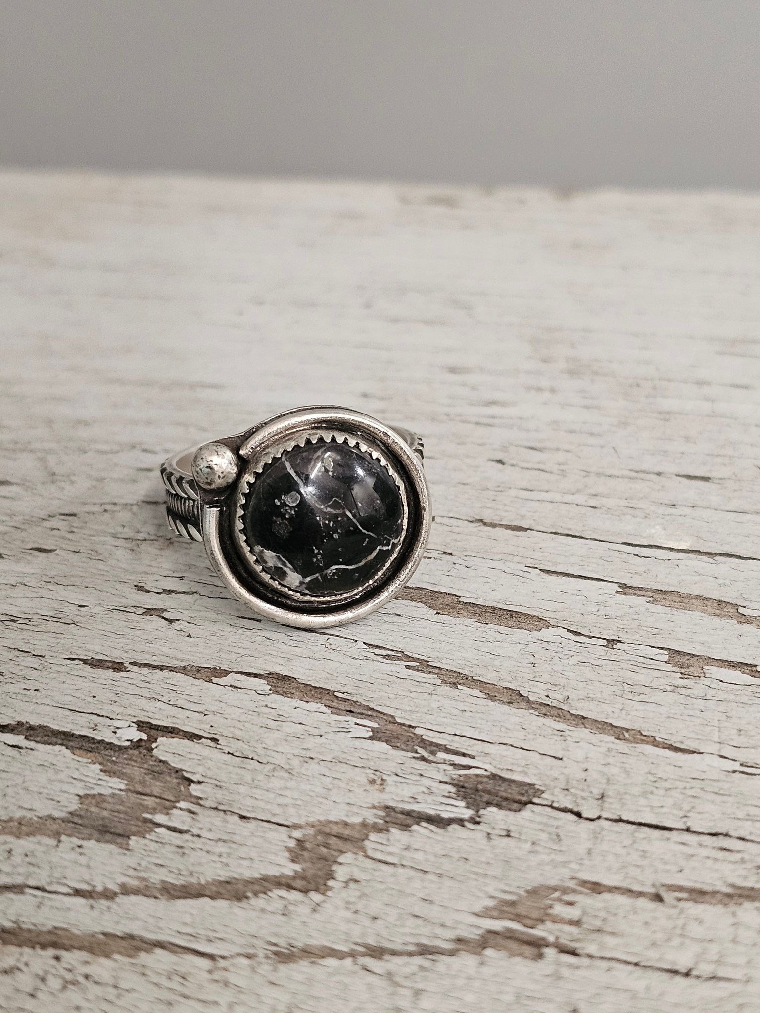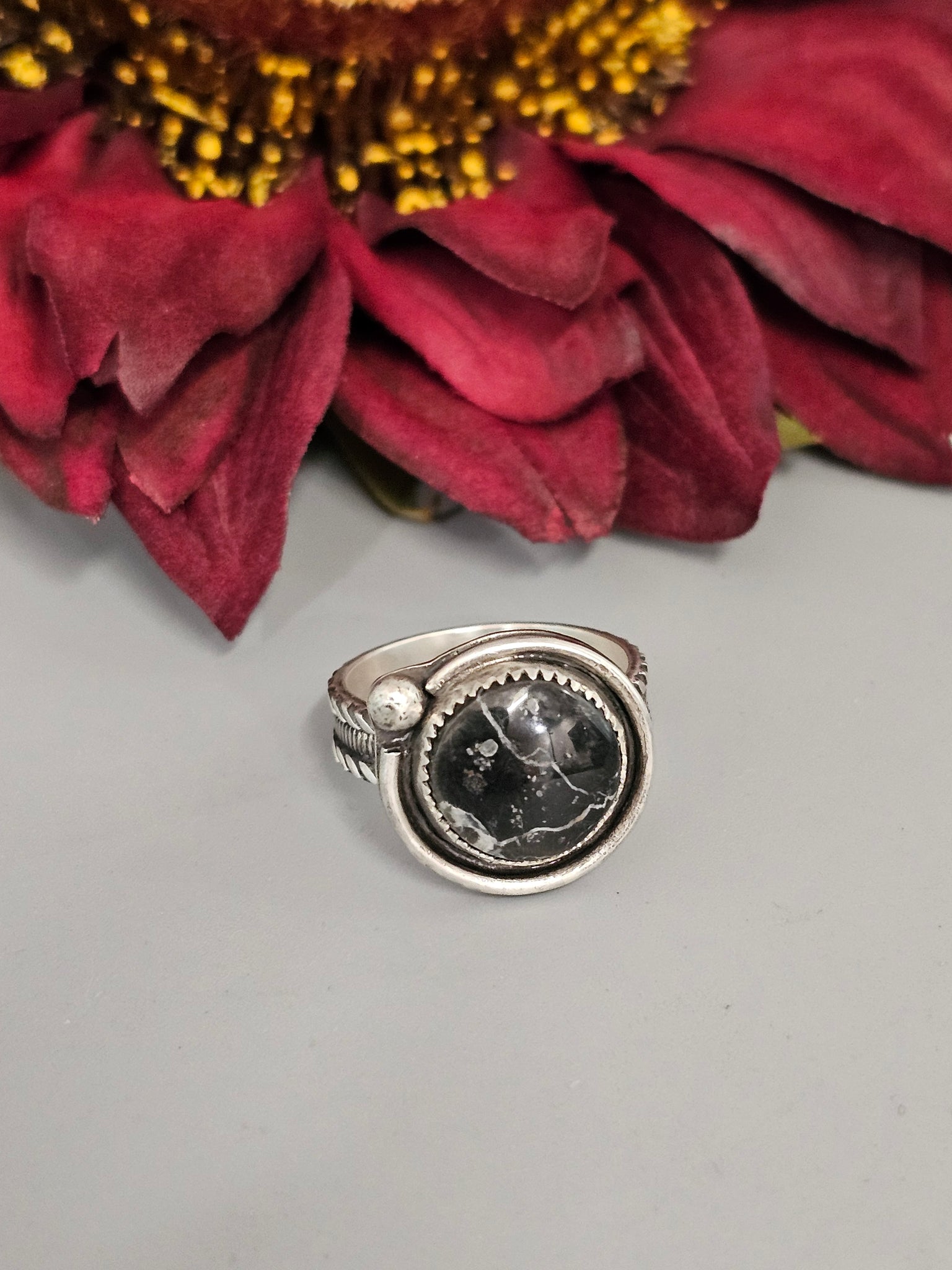 This Stunning White Buffalo circle stone surrounded with a serrated bezel a round wire and 1 ball with Sterling Silver Zipper Wire Band.